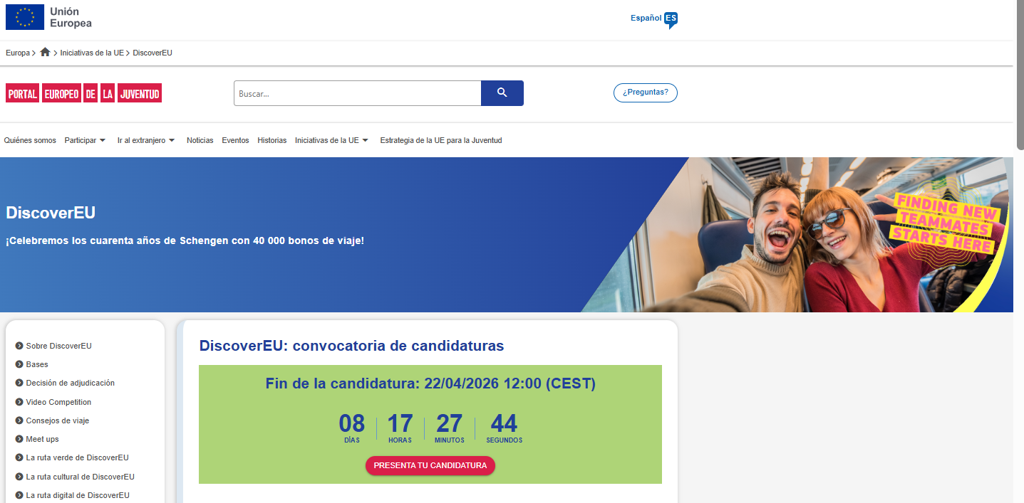 La Comisión Europea ha puesto en marcha hoy una nueva ronda de DiscoverEU, el programa que ofrece a miles de jóvenes de 18 años la oportunidad de explorar Europa en tren y de forma gratuita. La convocatoria estará abierta a partir de hoy a las 12. 00 (hora central europea) hasta el 22 de abril de 2026 a las 12.00 (hora central europea), coincidiendo con el inicio de la Semana Europea de la Juventud 2026.